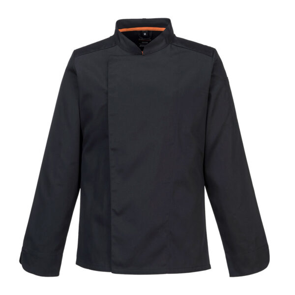 Diese moderne Stretch Kochjacke bietet dank des leichten Materials und der ergonomischen Passform hohen Tragekomfort. Ideal für Köche und Küchenpersonal.